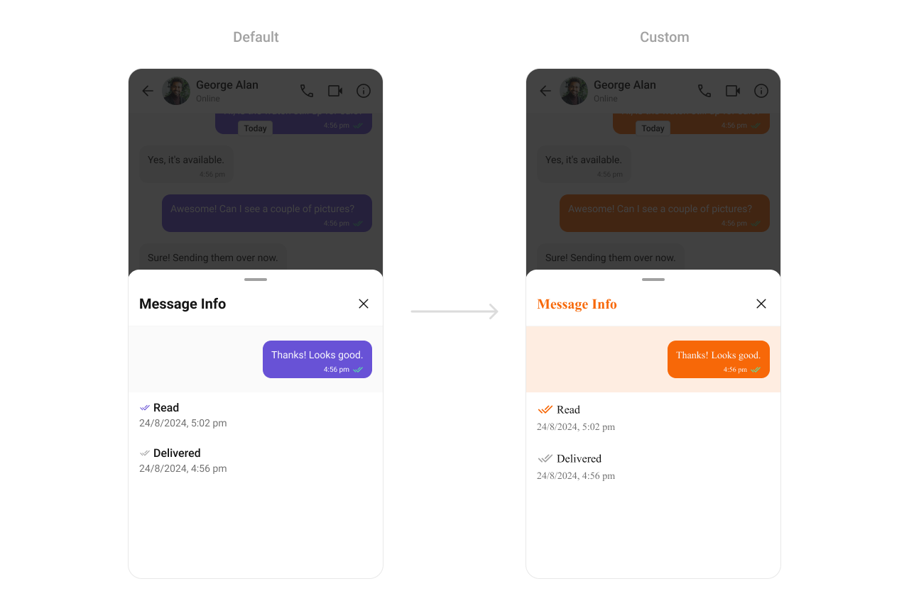 TheCometChatMessageInformation Component displays metadata for messages, such as delivery timestamps, sender details, and read receipts. Customization options include text styles, colors, and alignment, making it adaptable to various app layouts.