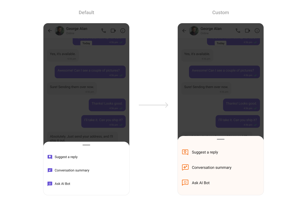 TheCometChatAIOptionSheet Component offers AI-powered action options, like generating replies or initiating voice-to-text commands. It allows developers to style icons, colors, and interaction elements for a polished and user-friendly interface.