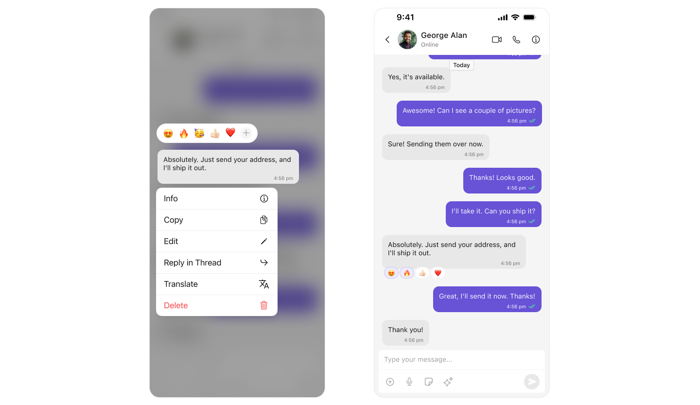 Message ComposerMessage Composer works seamlessly with Quoted Message by showing the quoted reply above the input field, letting users compose their response in proper context.