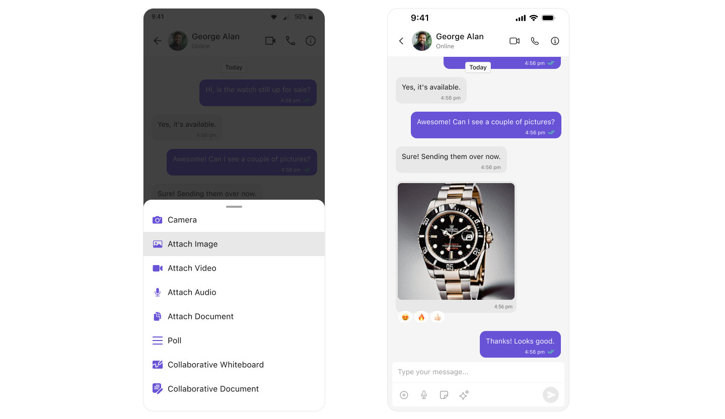 Beyond text, CometChat allows users to share various media types within their conversations. This includes images, videos, audio files, and documents, enriching the chat experience and enabling more comprehensive communication.