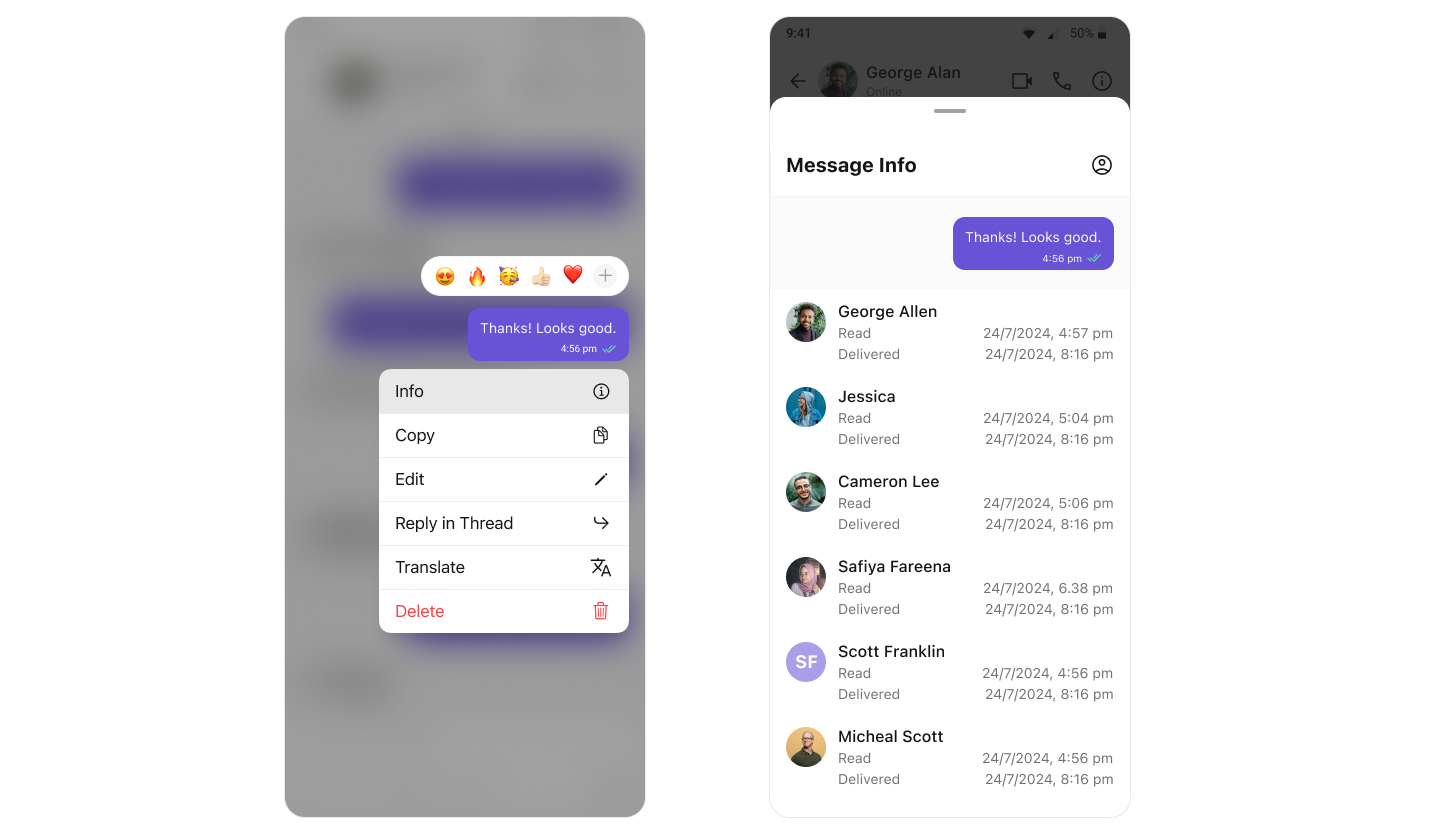 CometChat’s Read Receipts feature provides visibility into the message status, letting users know when a message has been delivered and read. This brings clarity to the communication and ensures users are informed about the status of their messages.